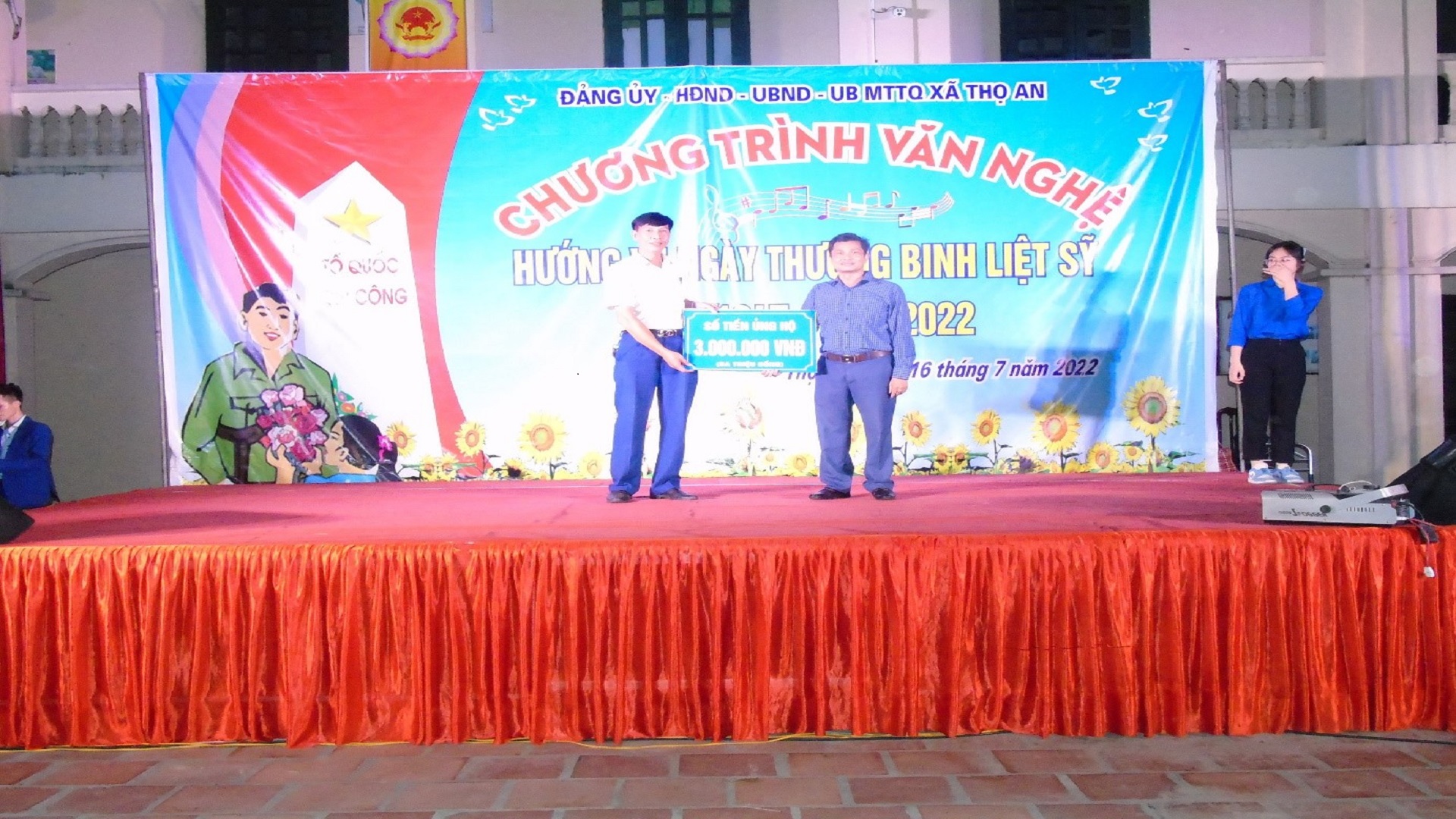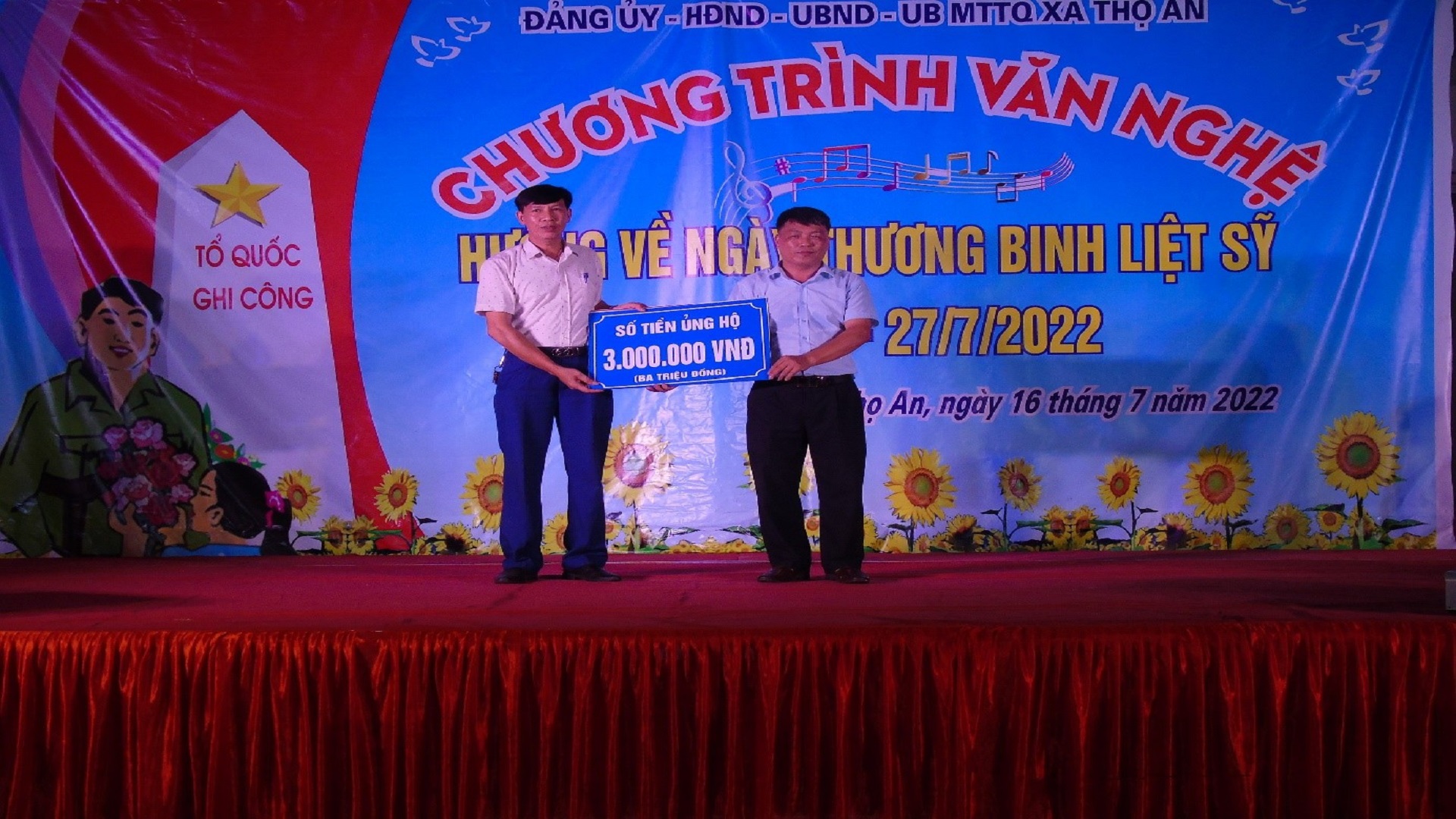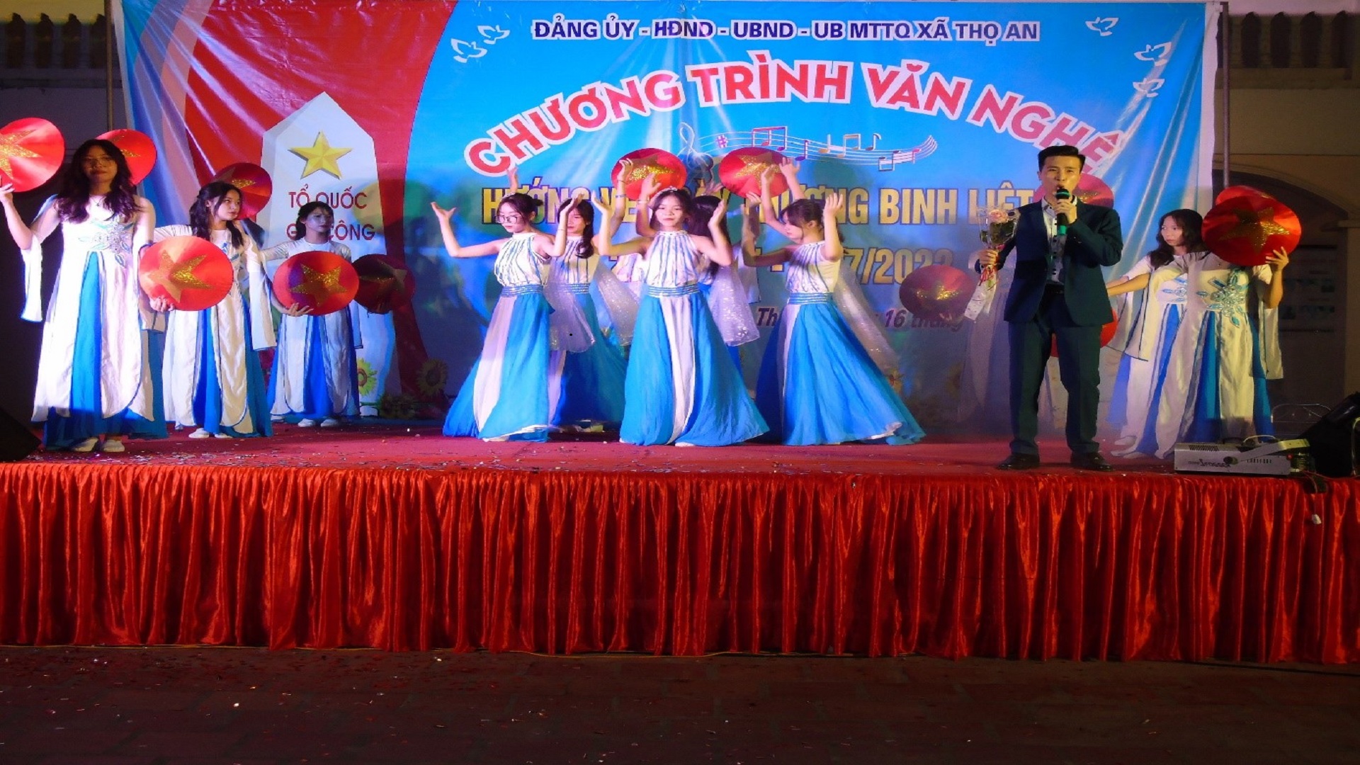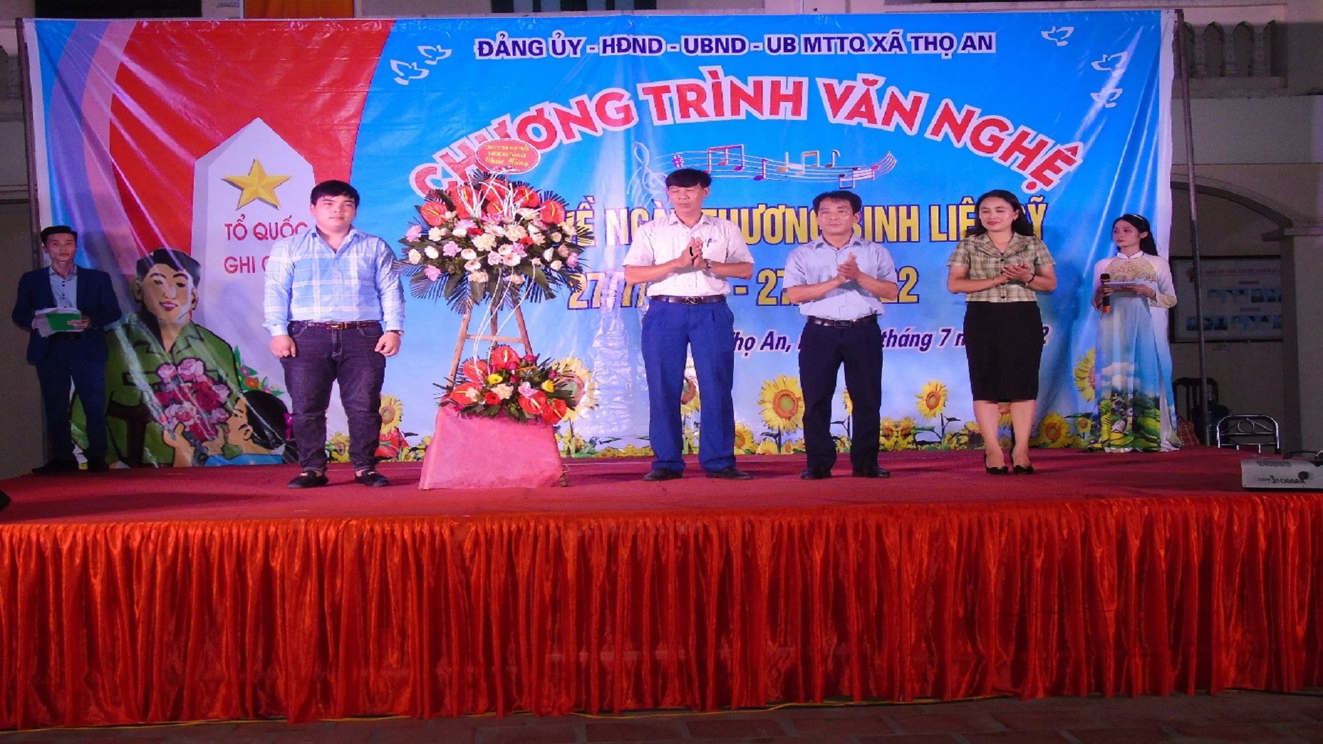 Hướng tới kỷ niệm 75 năm ngày thương binh liệt sỹ (27/7/1947 - 27/7/2022), tối ngày 16/7/2022, tại sân UBND xã, Đảng ủy – HĐND – UBND - Ủy ban MTTQ Việt Nam xã Thọ An tổ chức Chương trình văn nghệ “Hướng về Ngày Thương binh – Liệt sỹ”. Đến dự và cổ vũ đêm văn nghệ có lãnh đạo Đảng ủy, HĐND, UBND, Ủy ban MTTQ, các ngành, đoàn thể xã và đông đảo nhân dân trong và ngoài xã đã về tham dự và cổ vũ.